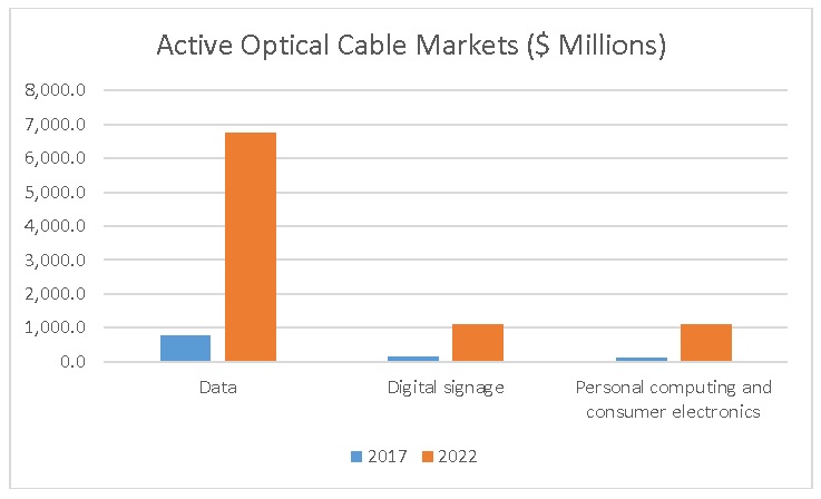 Charlottesville, Virginia: In its just-released report, “Markets for Active Optical Cables: 2017 – 2026,” Communications Industry Researchers (CIR) claims revenues from AOCs will reach $8.9 billion by 2022 compared with $1.1 billion in 2017. Much of this growth will come from a rush to install 100 Gbps links and the growth of hyperscale data centers. CIR is also seeing important new opportunities emerge for AOCs in 25 GigE, digital signage and personal computing.